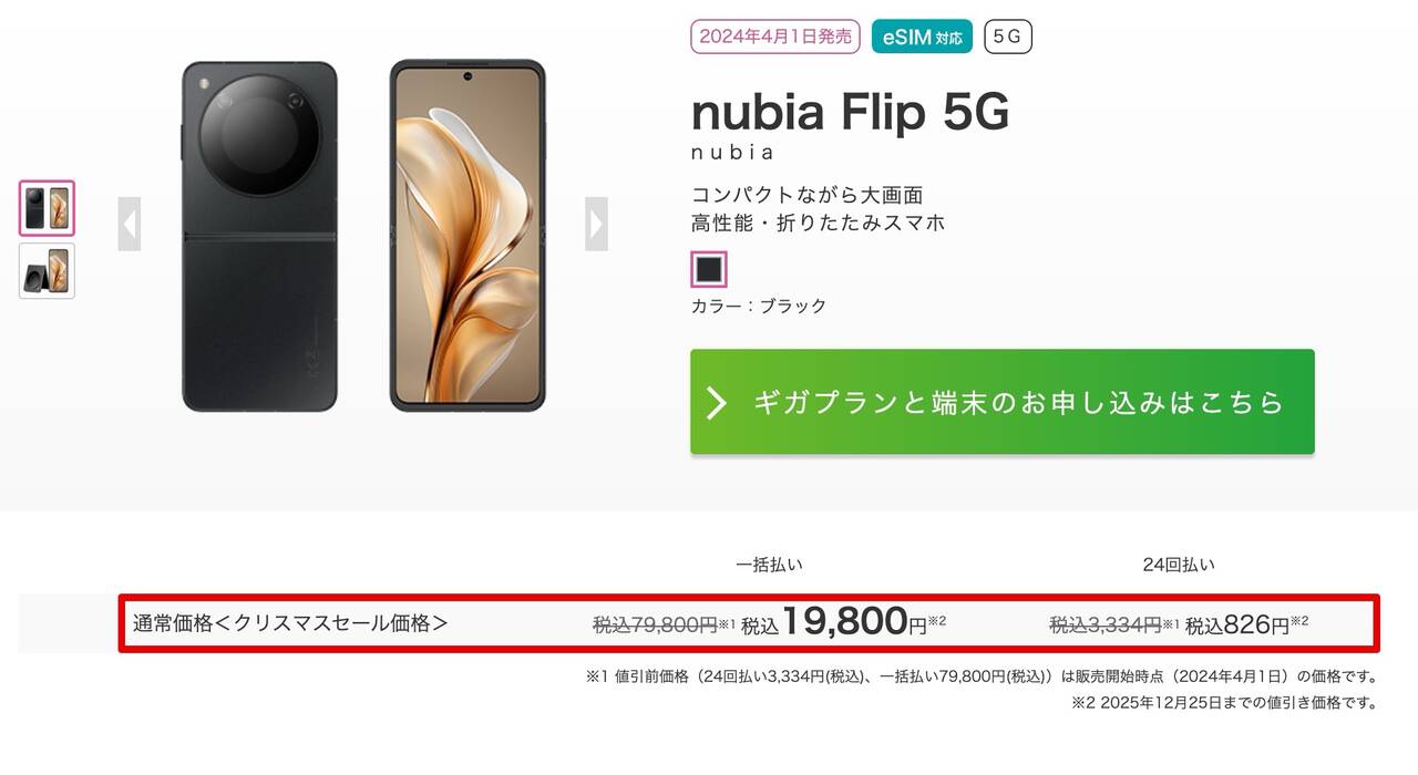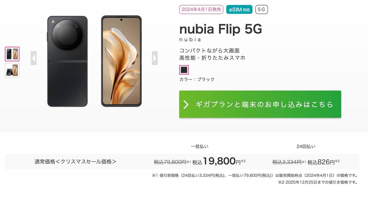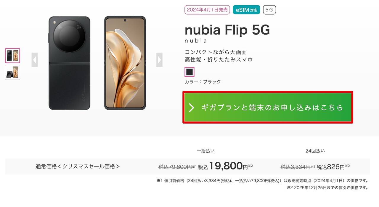 ▼nubia Flip 5Gのページに行くと・・・「ギガプランと端末の申し込みはこちら」と書いてます。↓