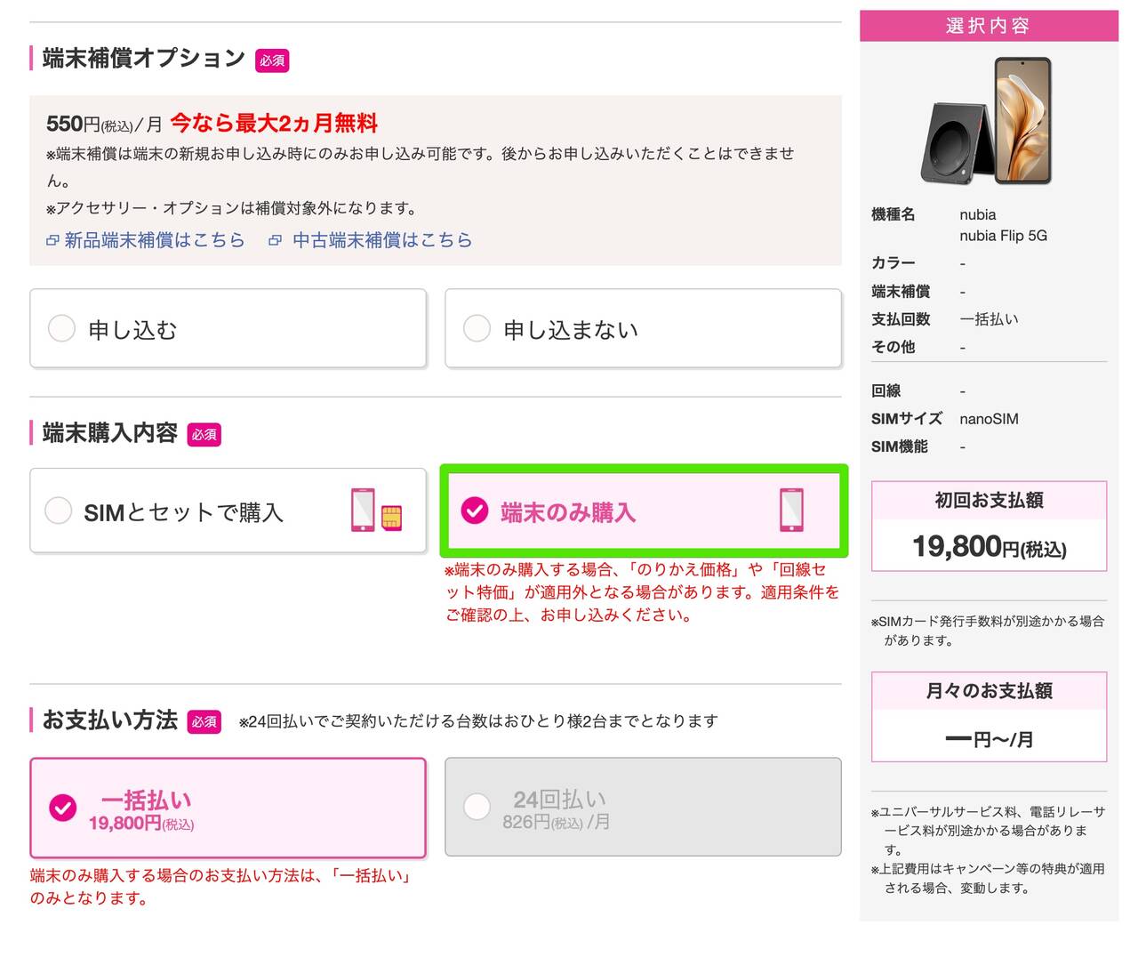 ▼申し込み画面が表示されるので少しスクロールすると・・・「端末のみ購入」のチェックがあった!↓