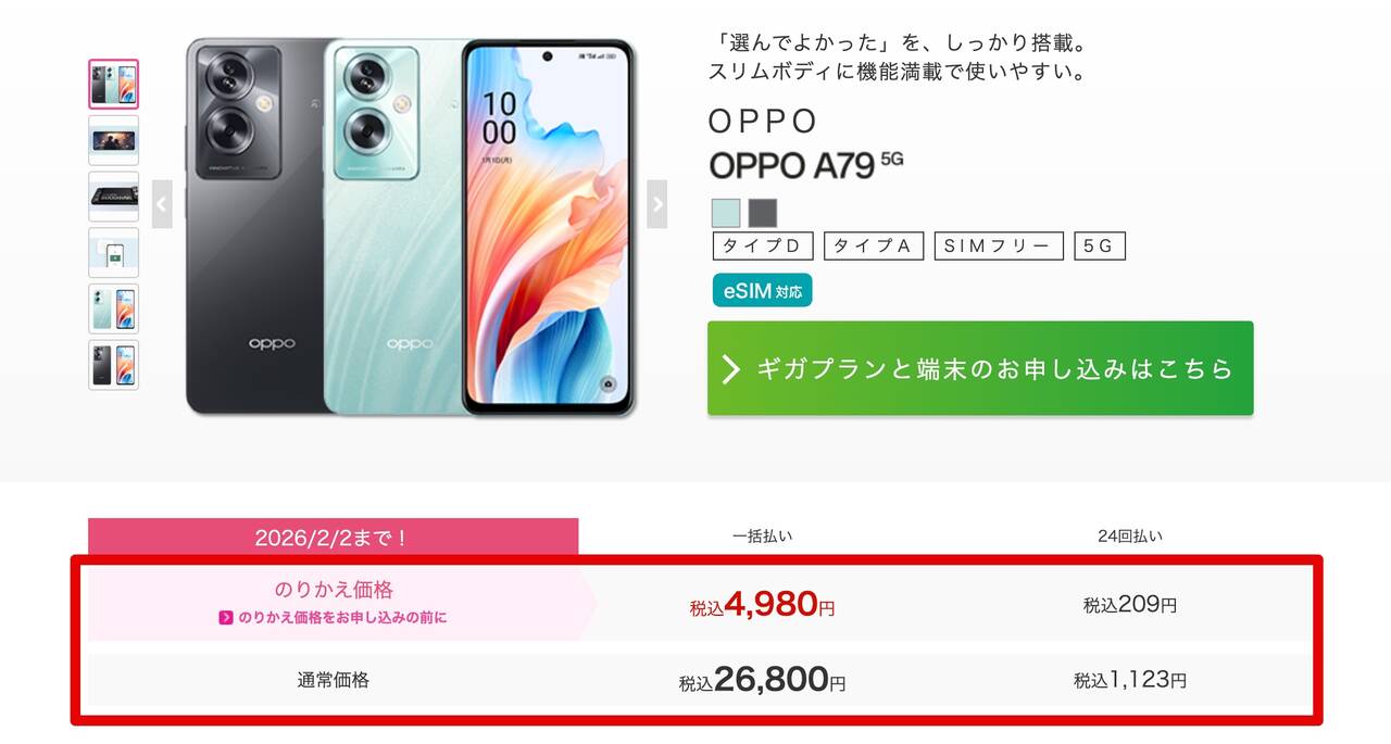 ▼一方でこっちの製品は「のりかえ価格(MNP)」は端末価格がガッツリ割り引かれて4,980円になってますが、通常価格の割引はありません。なので端末のみ購入する場合の価格は26,800円なので旨味はありません。↓
