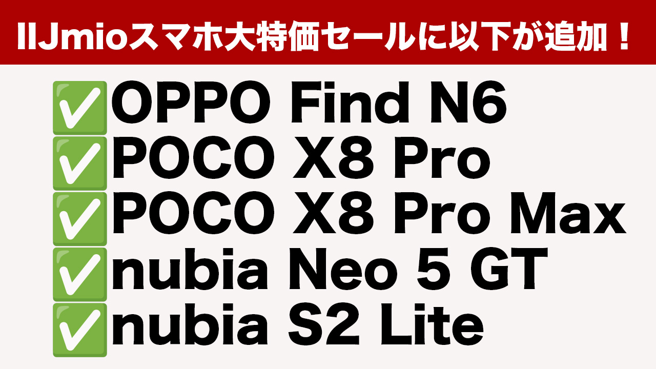 IIJmioはスマホ大特価セールを定期的に開催しています。現在開催中の内容は【2026年4月最新】IIJmioのスマホセール情報まとめに書いてますが、新たに5機種が追加されました!