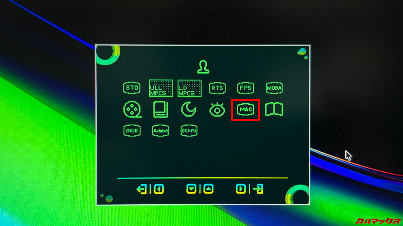 ▼本機は簡単にMacBookのディスプレイ画質に合わせられるピクチャーモードが備わっています。ピクチャー設定で「MAC」というアイコンを選べばOK。↓