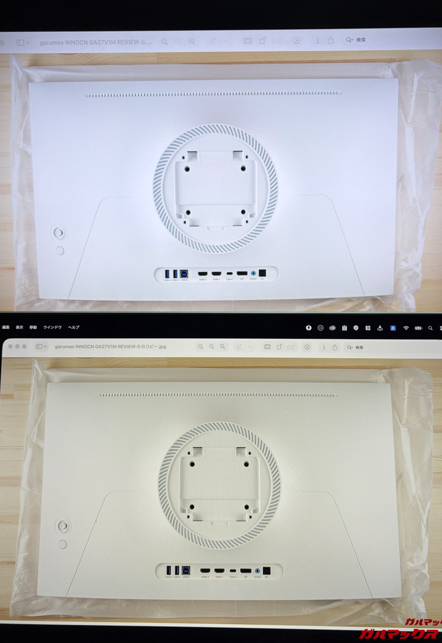 ▼以下は本機とMacBook Proを縦並びで置いた状態で本機をMACモードに変更して撮影したものです。色が全然違いますね。↓