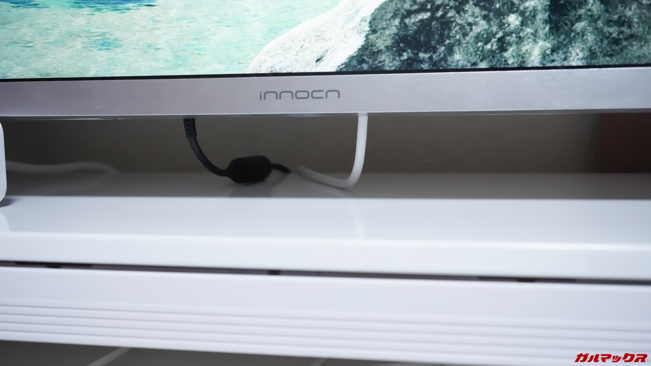 ▼INNOCN 27M2Vは下部にケーブルが流れる端子の向きだったので、モニターアームを使ってディスプレイを下げた時にモニター台に干渉していたんですよね。↓