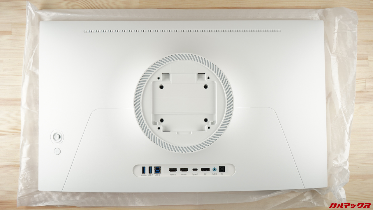 ▼背面にはRGBライトが埋め込まれていました。壁際に設置すると光が反射してモニター周囲が美しい光のモヤで包まれている感じになりますよ。↓