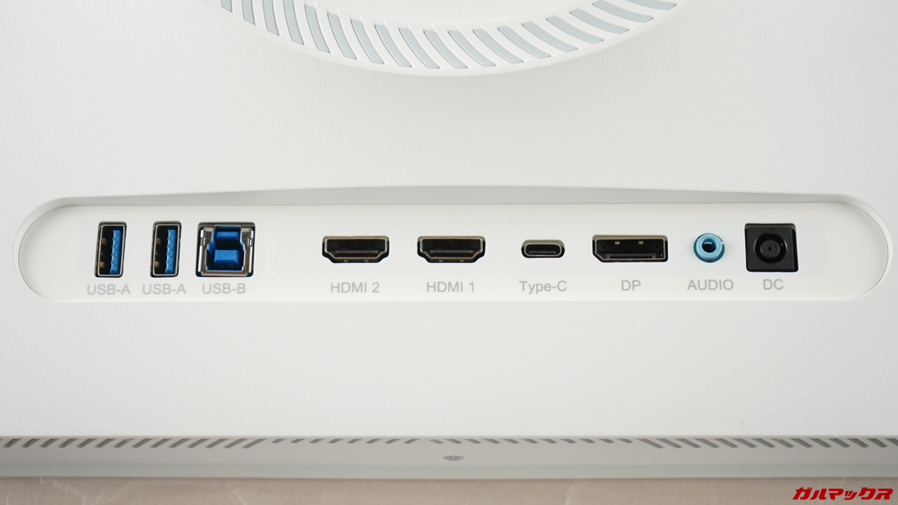 ▼端子類はこんな感じ。HDMI 2.1が2つ、DP 1.4が1つ、90W給電対応のUSB‐Cが1つ備わっています。↓