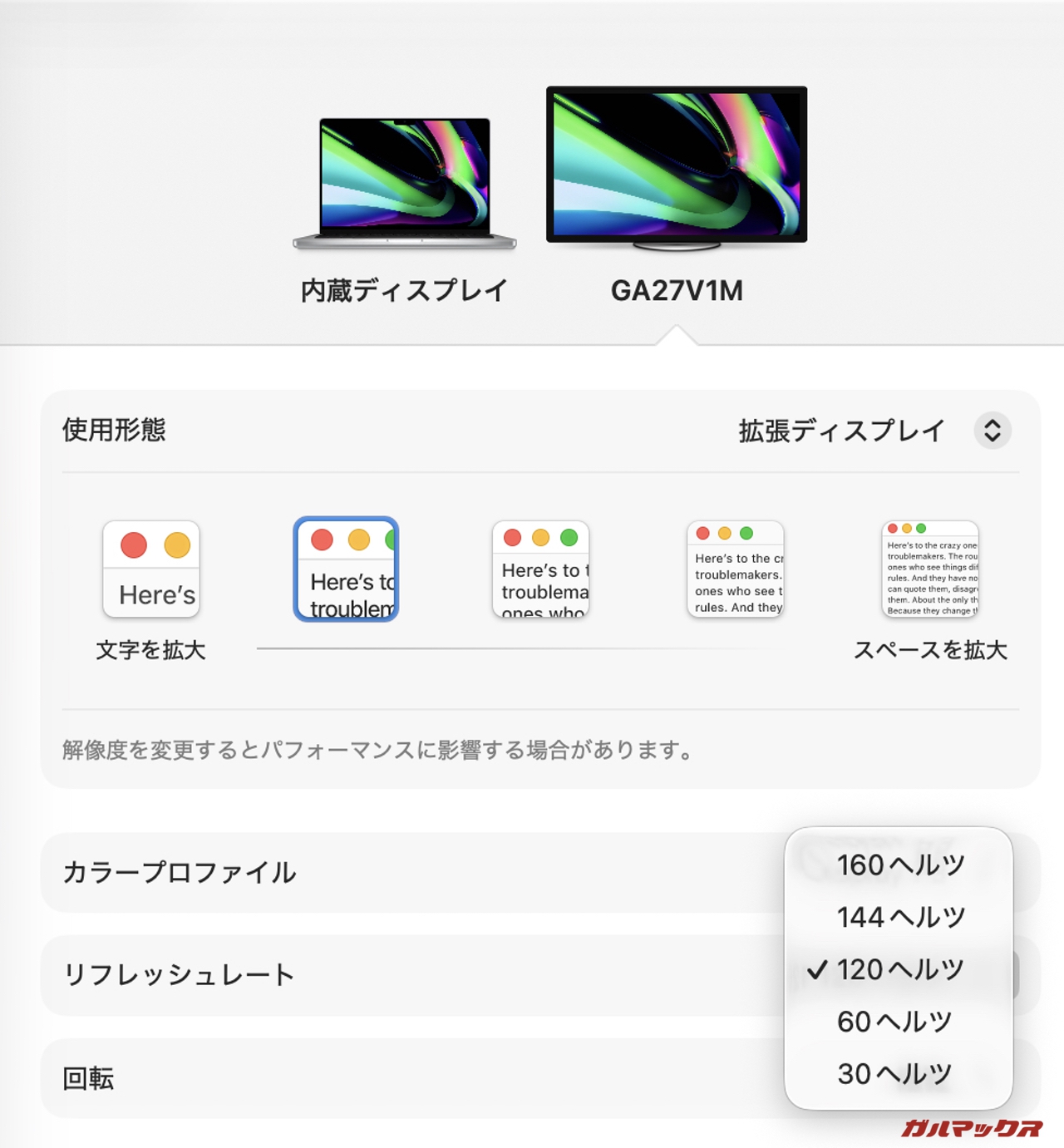 本機は最大160Hzで使える点はもちろん魅力な部分ですが、僕はMacBook Proと同じ120Hzで合わせられる点が嬉しかったですね。