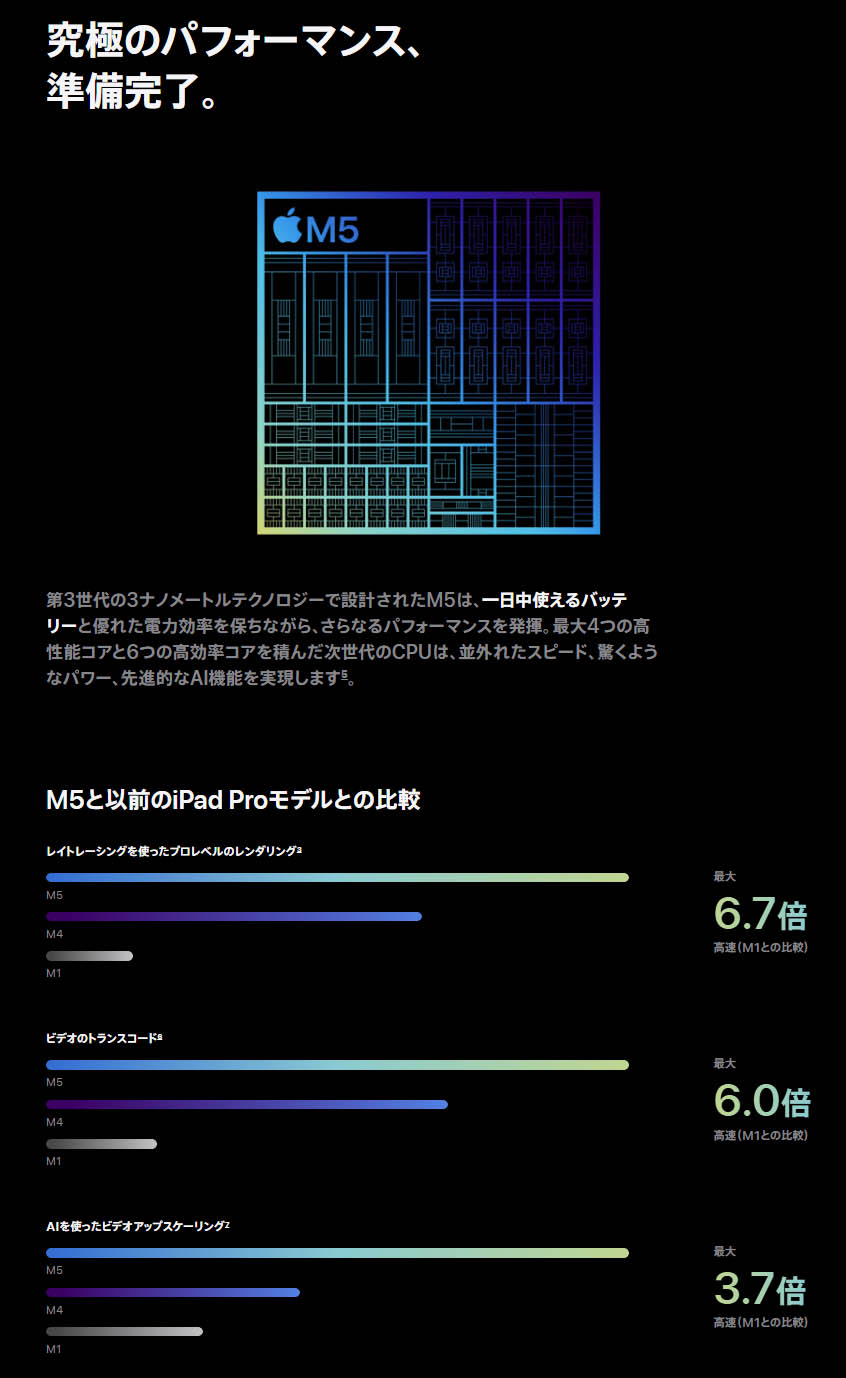 バーの長さで比較しようと思ったら、バーの長さの割合と性能差はどうやら一致していない(例えばビデオトランスコードの項目ではM5のバーはM1の5.26倍の長さである)ようなので、いまいちわからず。M4 iPad ProのページではM2と比較しているので、先代からどれぐらい強化されたのか正確な値は不明です。このわかりにくさはいつものAppleらしいですね。