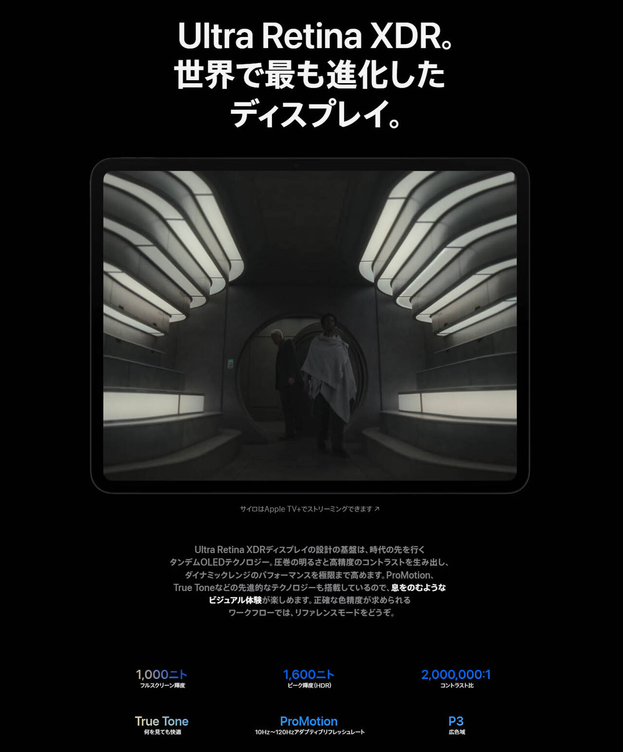 ▼ディスプレイは有機ELで、10-120Hzの可変リフレッシュレートに対応しています。解像度は11インチモデルが2420×1668、13インチモデルは2754×2064。先代と同じ構成ですね。書いてあることも同じ。↓