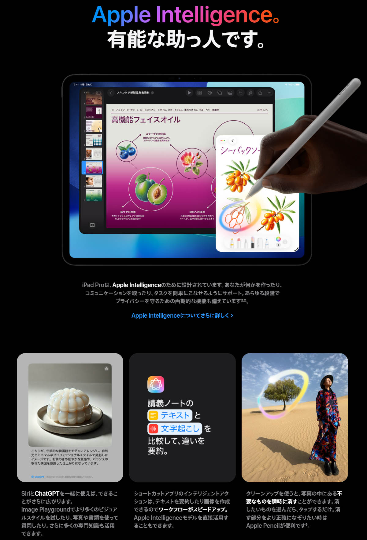 ▼OSにはiPadOS 26を搭載。Apple Intelligenceに対応し、チャットAI、テキスト要約、画像生成、AI消しゴムなどのよくあるAI機能はしっかり搭載されています。↓