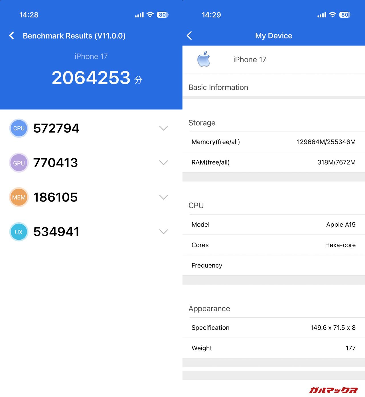 ▼総合スコアは約24万点アップ、GPUスコア(ゲーム性能)は約13万点アップといったところ。左がiPhone 17、右がiPhone 16。↓