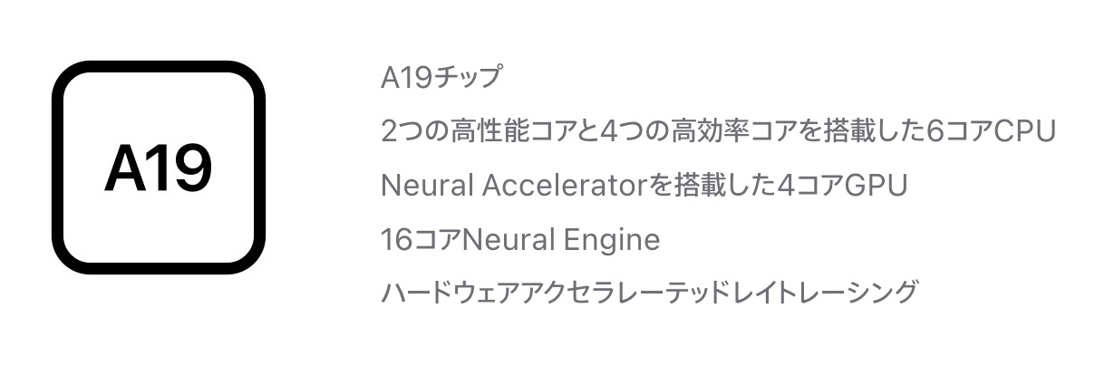 ▼iPhone 17eが搭載するSoCはA19となりiPhone 17シリーズと同じ世代となった。↓