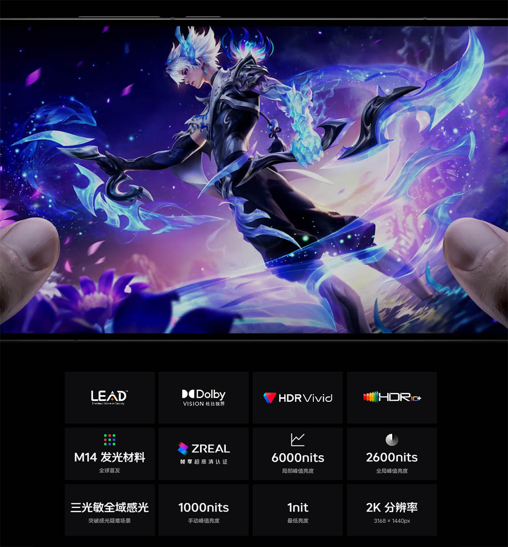 ▼ディスプレイは6.85インチの有機EL。解像度は3168×1440で、リフレッシュレートは144Hzに対応しています。ローカルピーク輝度は6000nitsに達します。↓