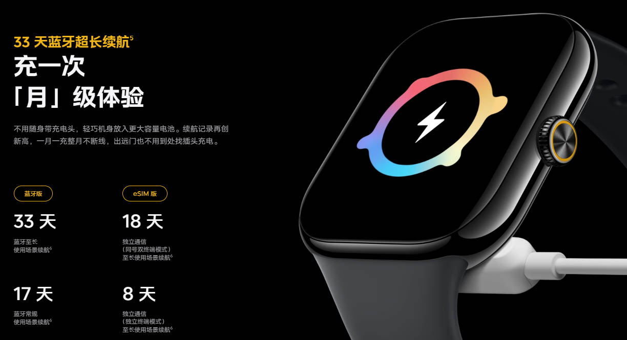 Bluetooth版は通常利用で17日、省電力モードで最大33日と電池持ちはかなり良いですね。eSIM版は最長18日間の連続使用が可能とのこと。SIM対応モデルだと1~3日のものが多いため、1週間以上持続するのはかなり優秀です。