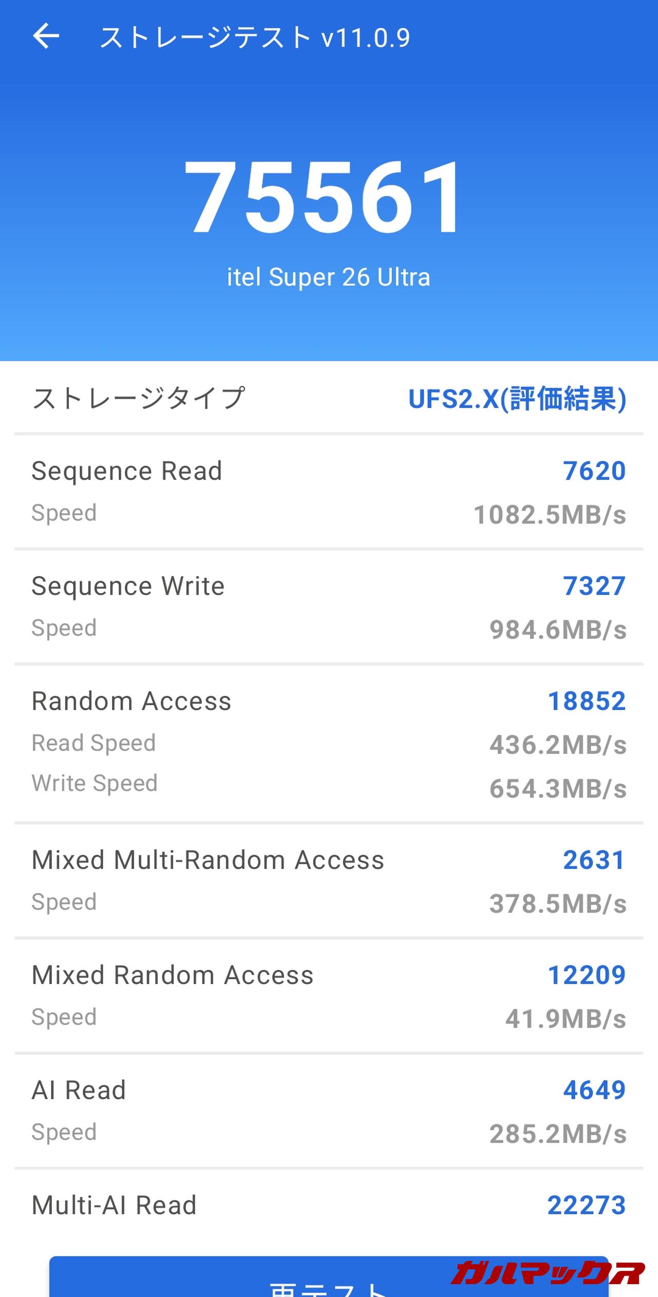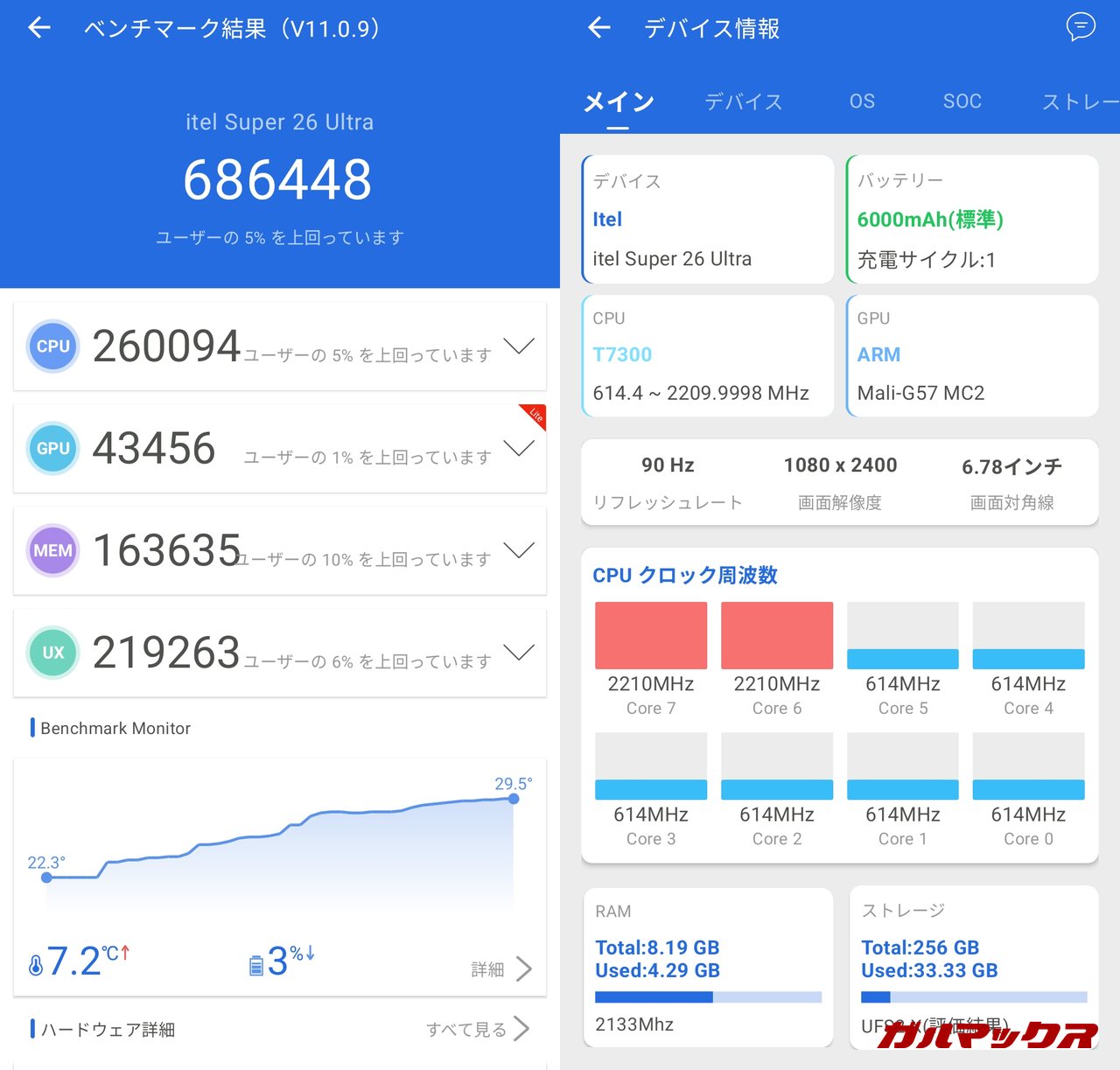 itel SUPER 26 Ultraが搭載するSoCはUNISOC T7300です。メモリ(LPDDR4X)は8GB、ストレージ(UFS2.2)は128GB/256GBです。レビュー機は256GB構成です。