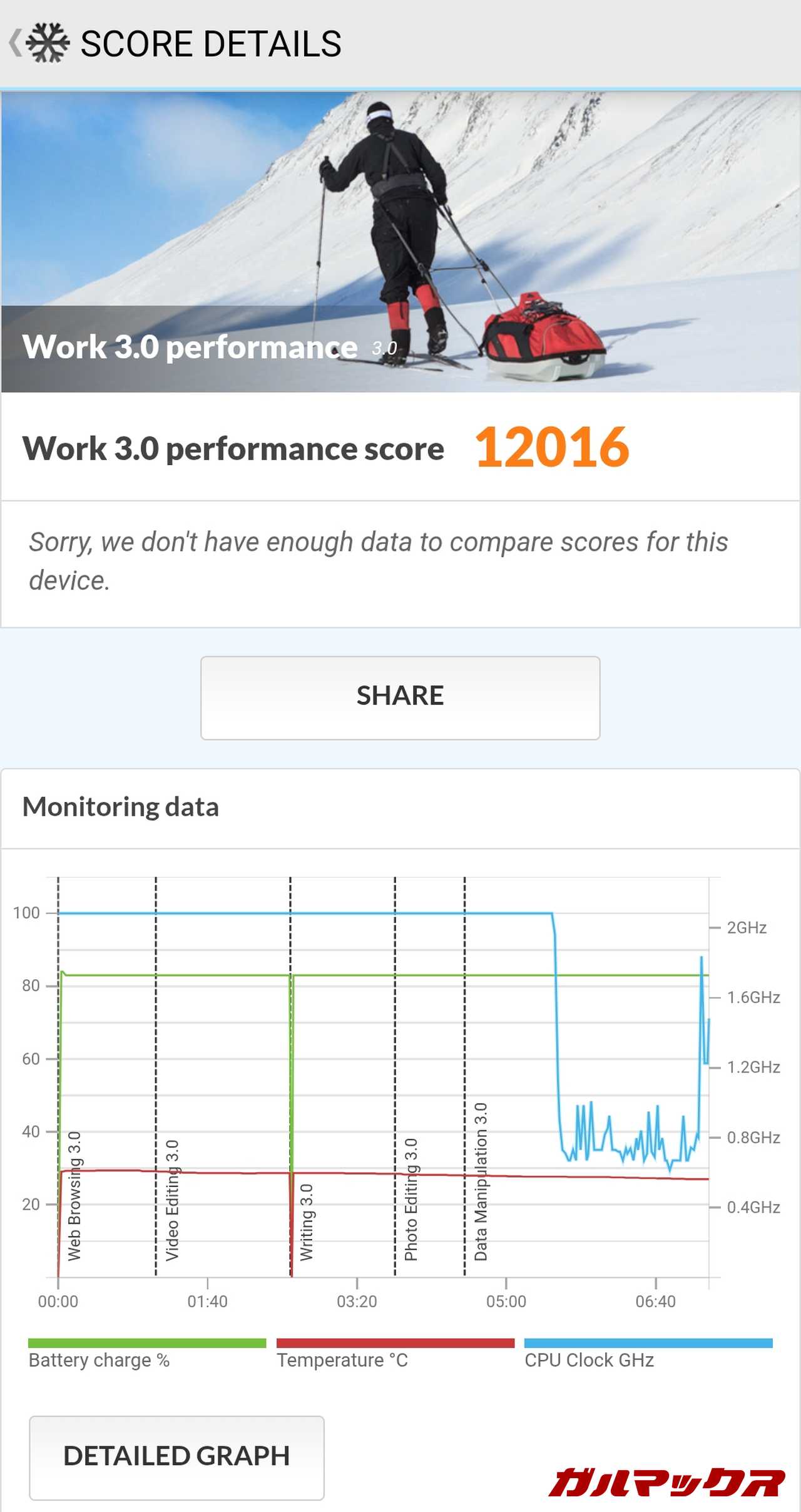 ▼PCMarkのバッテリーテストを行った結果は以下の通り(輝度を専用機器で110に設定)。100%→20%まで12時間37分となっています。↓