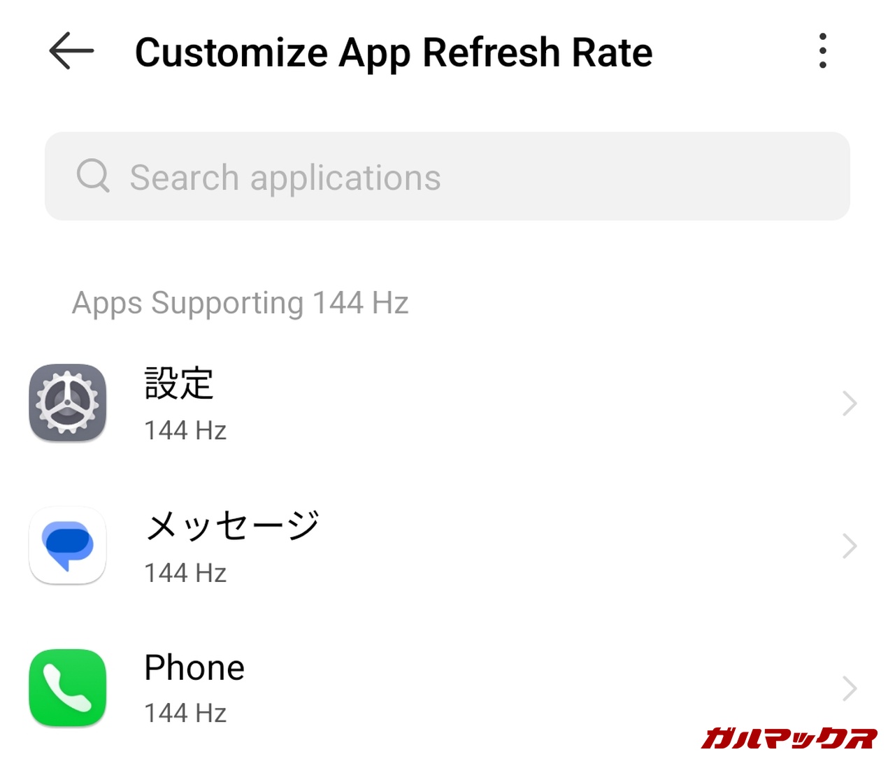 ▼しかし、蓋を開けてみれば144Hz対応アプリはほとんど存在しておらず、現時点で利用できるのは設定アプリ、SMSアプリ、電話アプリの3種類のみ。↓