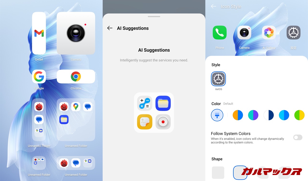 ▼フォルダだけでなくアプリアイコンも最大2×2に拡大することができます。独自ウィジェットもいくつか用意されており、Android標準のものではないデザインが統一されたものが使用できます。アイコンカラーや形の変更にも対応しています。↓