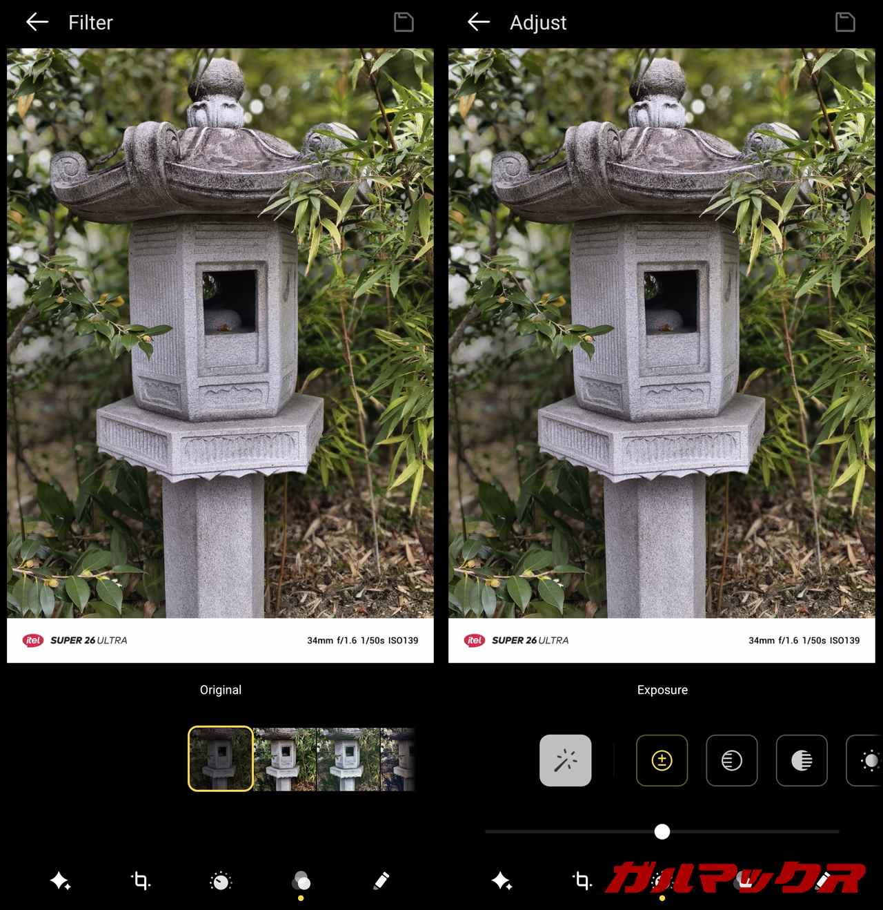 ▼フィルターは撮影前後どちらでも適用可能です。一度適用すると外すことができない点と、透かし部分にもフィルターが適用されてしまう点には注意が必要です。↓