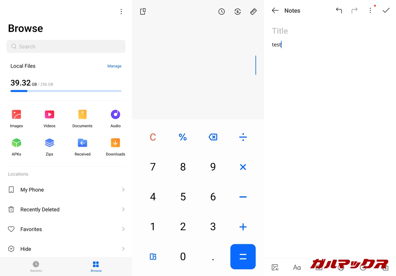 ▼ファイルマネージャー、電卓、メモアプリなどもオリジナルのアプリになっています。エントリー帯の端末ではGoogleの汎用アプリを使っている端末が多いですが、本機は自社アプリをきちんと開発しています。↓