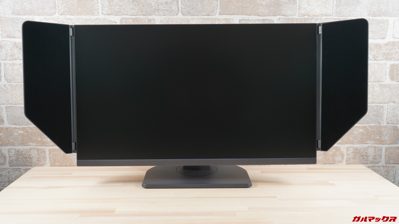 また、遮光フードもKTC MASTER 25M1は布張りを採用。写真でも分かる通り反射は明らかにBenQ Zowie XL2566X+よりも軽減されていました。