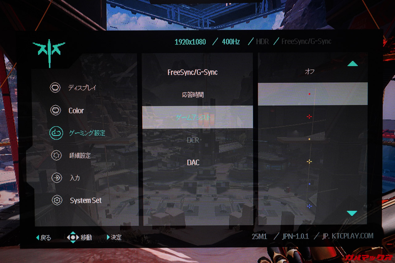 KTC MASTER 25M1は、暗い部分を明るくするブラックイコライザー機能が備わっているので、暗闇で角待ちしている敵も丸見えなんですよ。