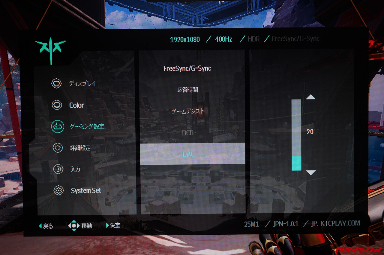 KTC MASTER 25M1では、DACという項目から20/40/60/80/100の5段階で設定できます。ちょっとややこしいですが、数値が少ないほど残像低減が強くなります。つまり残像低減の効果は20が一番強くて100が一番弱い。でも0はオフ。