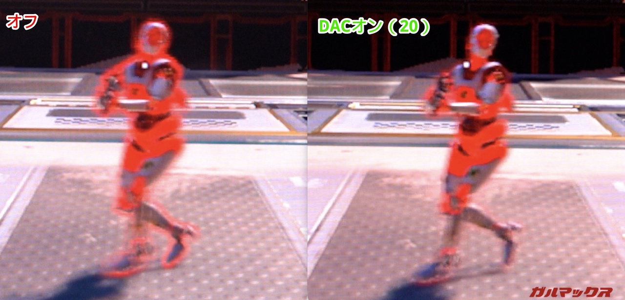 ▼実際にゲームでチェックしてみました。左がオフで右がオン(DAC/20)です。明らかオンのほうがクッキリと鮮明になってる!!!(画面を直接撮影している兼ね合いで滲んで見えますが、目視だともっともっとクッキリです!!!!)↓