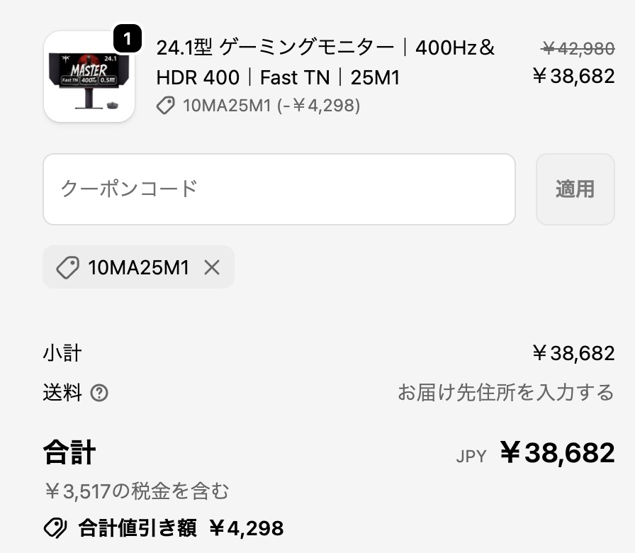 ▼執筆時点でKTC MASTER 25M1の定価は53,999円とBenQ Zowie XL2566X+の半値以下。セールの開催やクーポンの配布も定期的に行われており、執筆時点ではなんと4万円切り。恐ろしいコスパです。↓