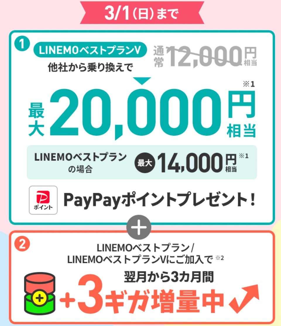 LINEMOへMNPを考えているなら今!PayPay2万円分とギガ増量キャンペーンやってるぞ!
