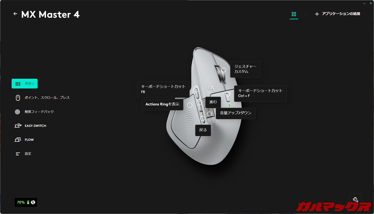 ▼このモデルに限ったことではないのですが、ボタン自体の役割もバッチリカスタマイズできます。MX Masterシリーズの強み。↓