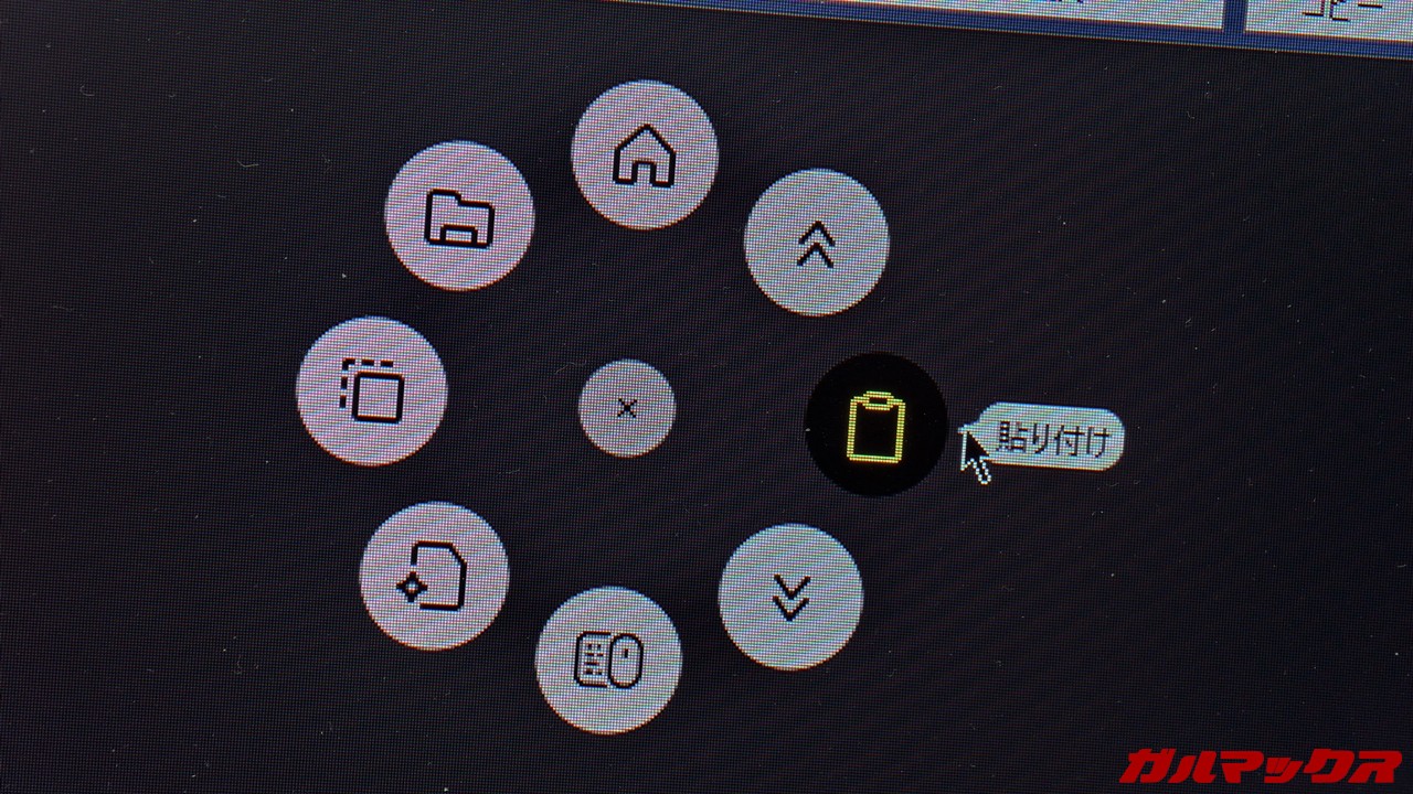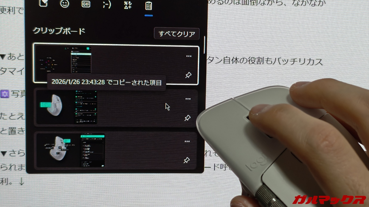 ▼さらに押したまま上下左右方向に動かすことで、それぞれに異なる機能を割り当てられます。筆者の場合は「ホイールをおしっぱで上に動かすことでクリップボード呼び出し」を愛用。これがくっそ便利でありがたすぎる。↓