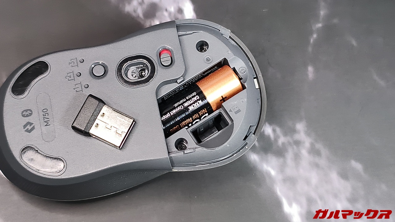 ▼あとLogicoolのマウスによってはレシーバーを内蔵できるモデルもあるんだけど、本機はそのレシーバーの収納口が無いです。持ち運ぶときも紛失のリスクを懸念するのはマイナス(写真はM750)。↓