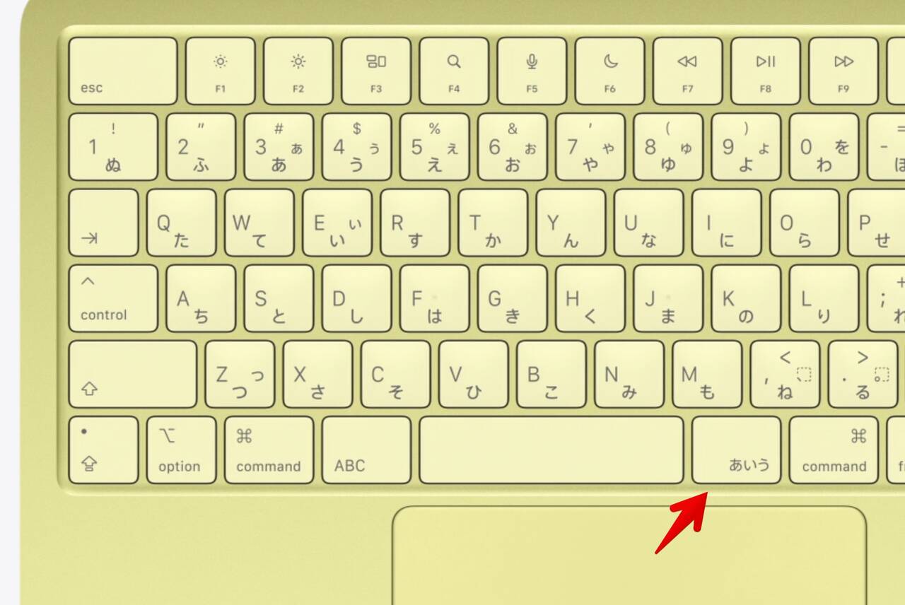 ▼キーボードは印字が「あいう」タイプ。新しいMacBookは「かな」じゃなくて「あいう」なのだ。あwいwうってwww書いてたらツボったwww。なおMacBook Neoはバックライトは無いので薄暗いカフェだと苦労するかも。↓