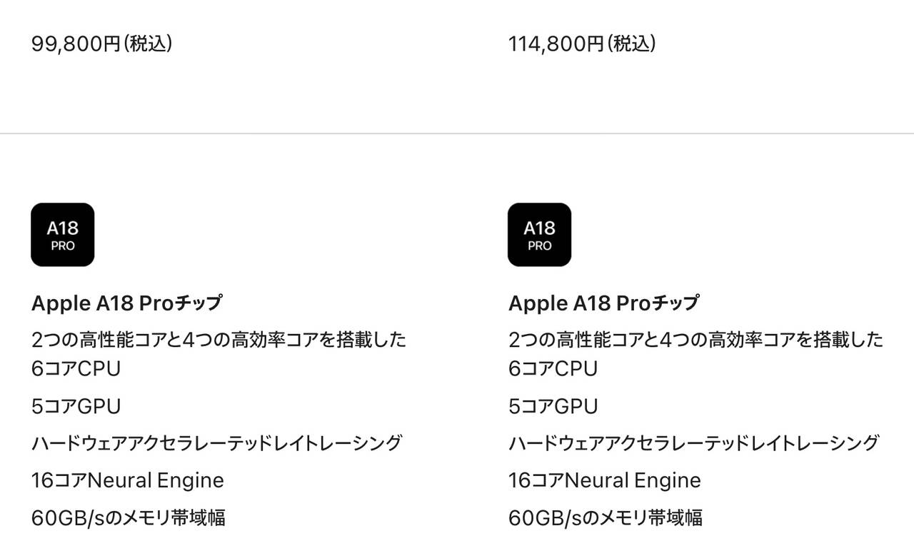 ▼MacBook Neoが搭載するSoCはA18 Pro(5コアGPU版)を搭載する。仕様を確認してみると256版と512版で違いはなさそう。↓