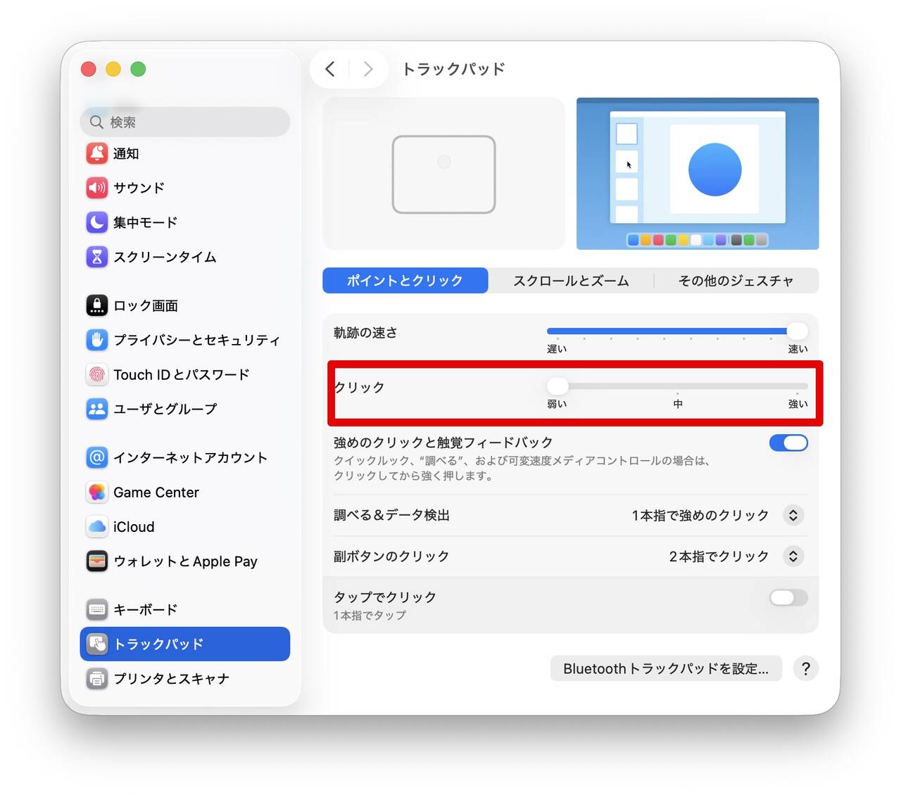 個人的にトラックパッドのクリック音は小さい方が好み。というわけで、私は感圧式のトラックパッドの設定項目でクリックを「弱い」にして使っている。こうすることで感圧式はクリック音を小さくすることが出来るのだ。