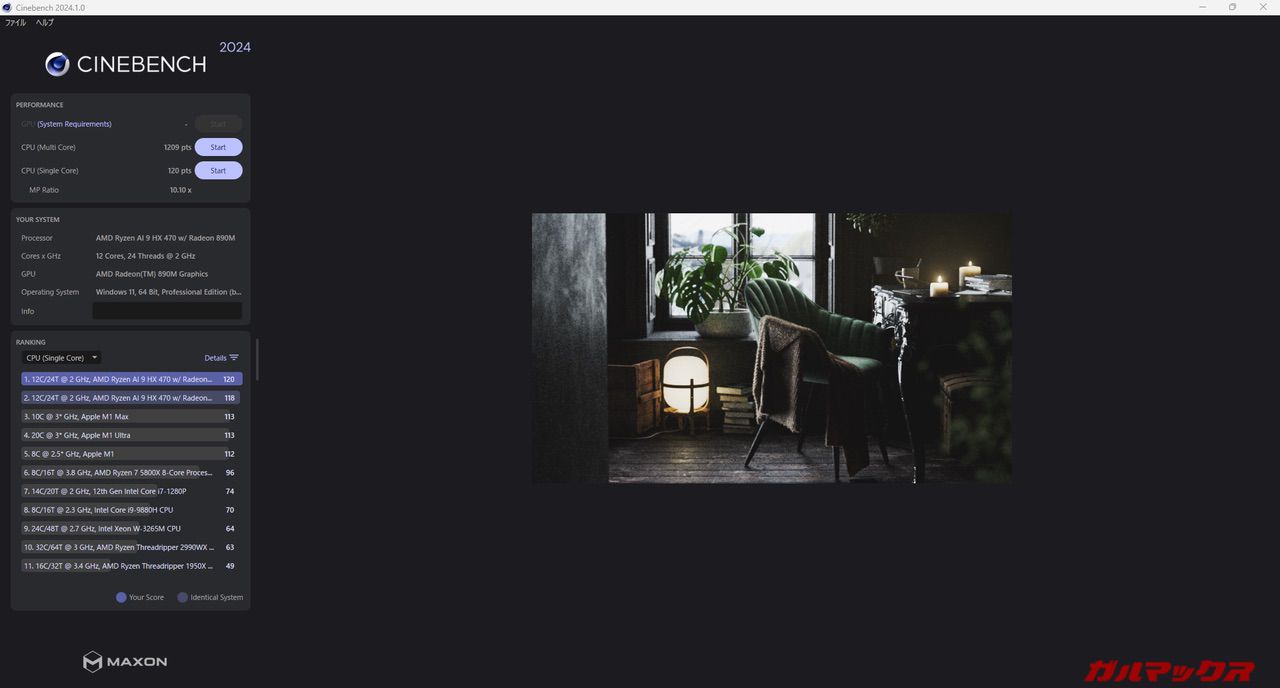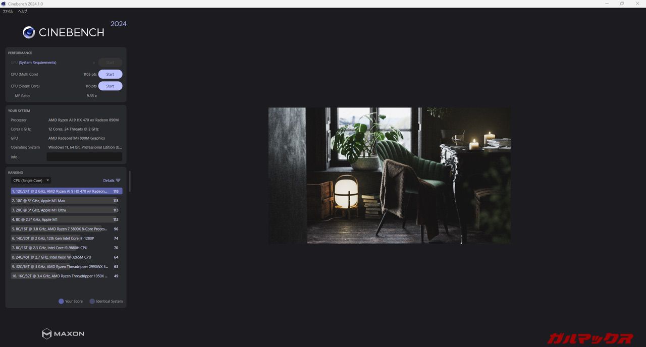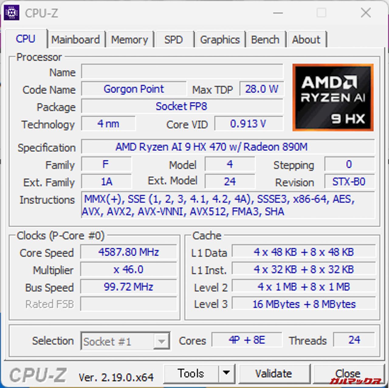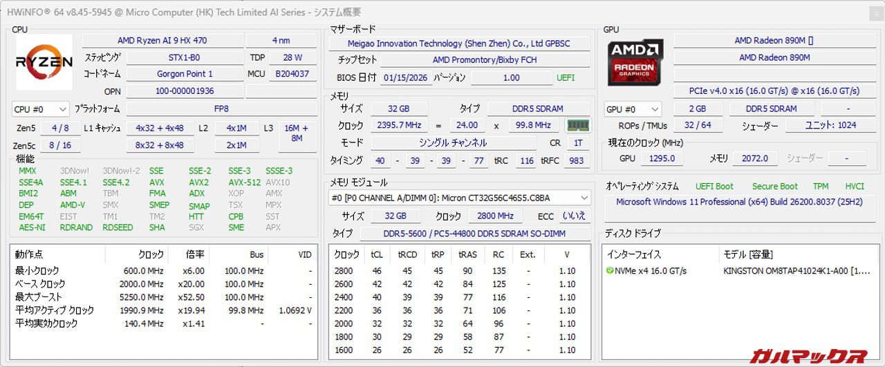本機が搭載するCPUはTDP28WのRyzen AI 9 HX470を搭載。レビュー機はメモリ32GBの構成となっている。なおメモリは上述通り1枚差しのシングルチャネルで駆動している。