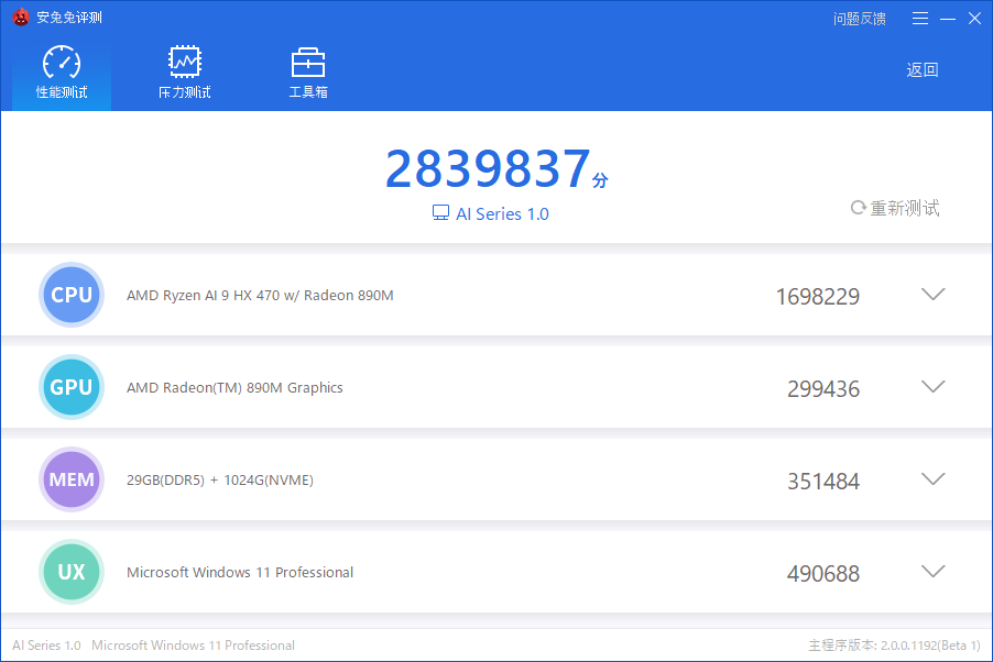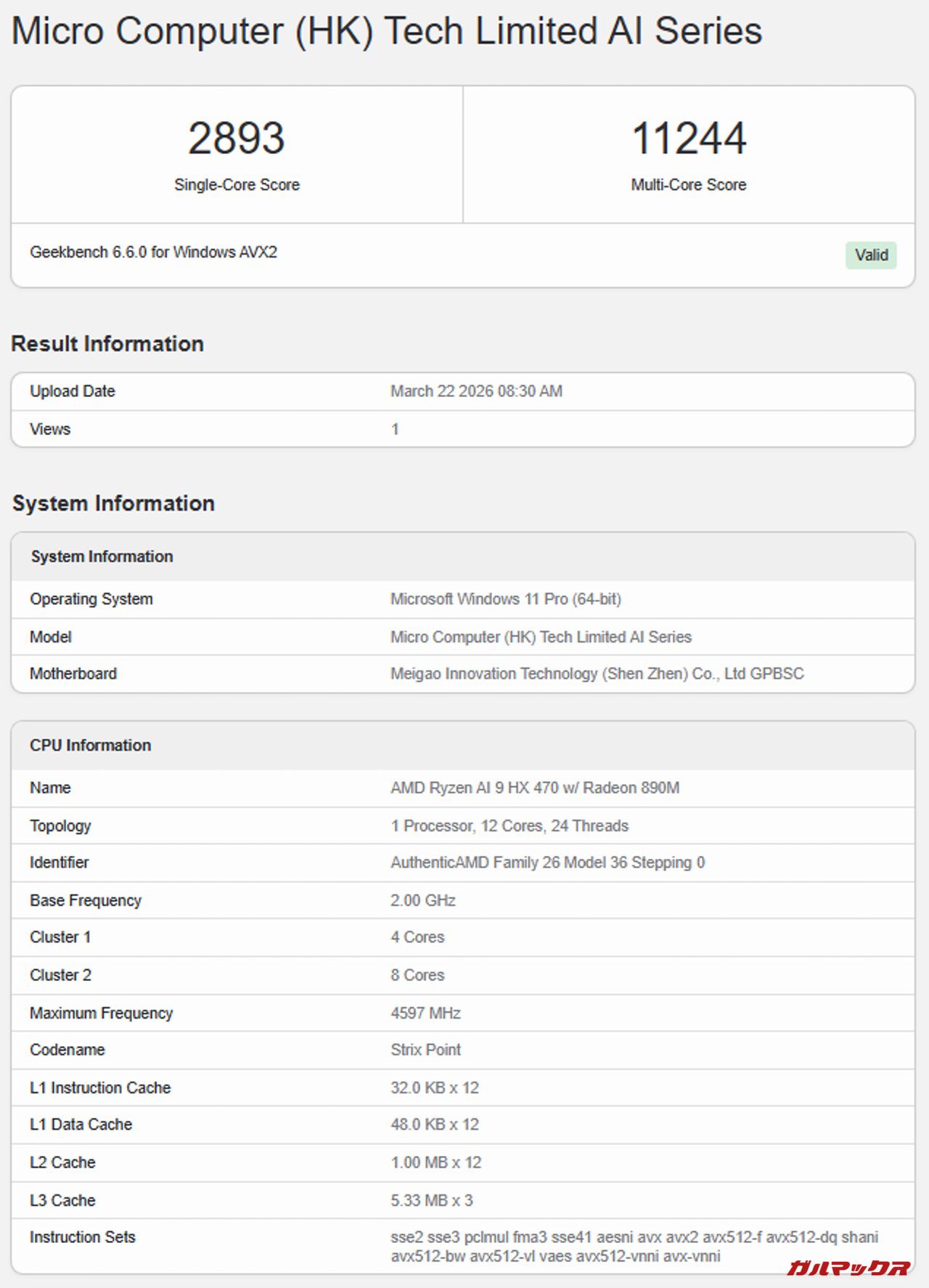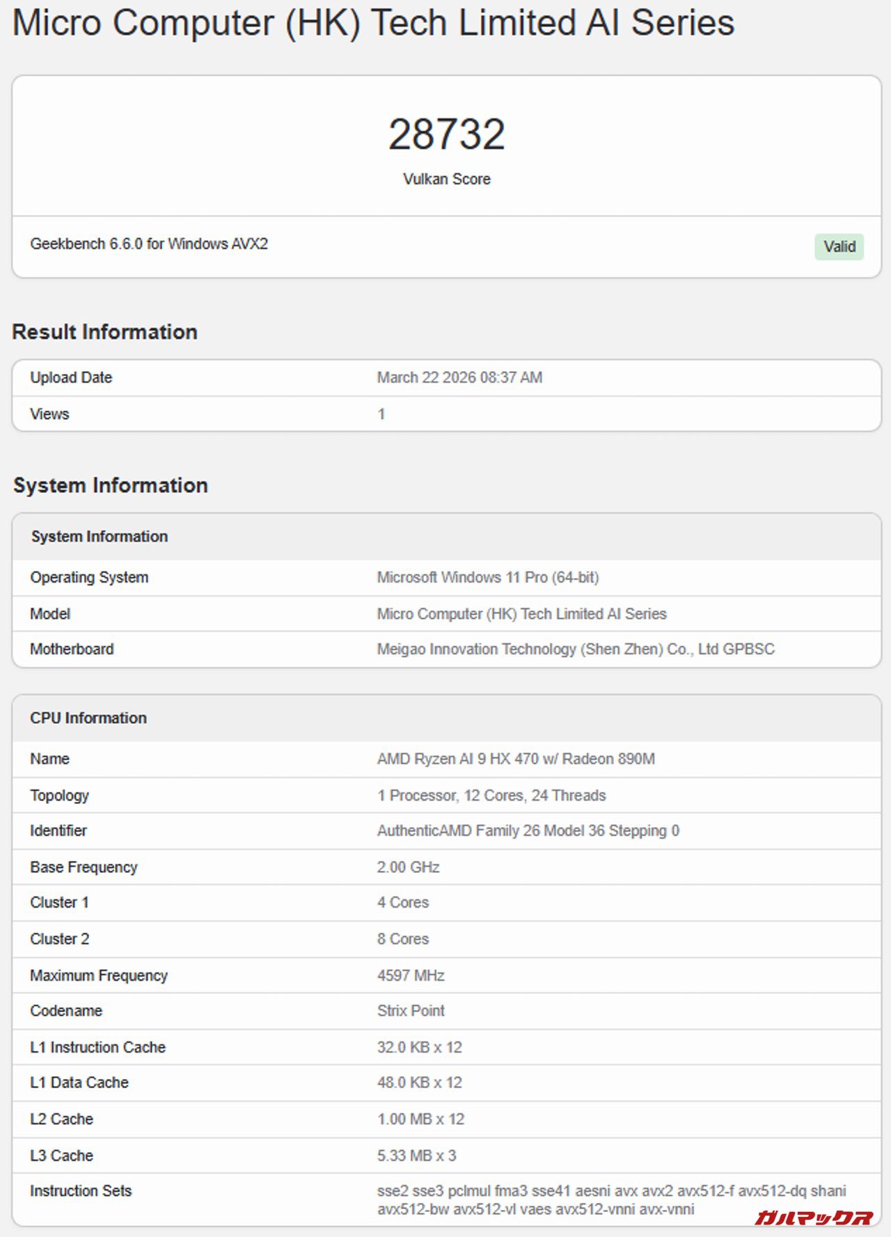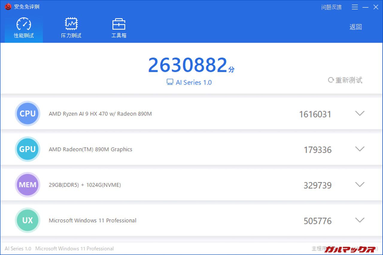 本機が搭載するCPUはTDP28WのRyzen AI 9 HX470を搭載。レビュー機はメモリ32GBの構成となっている。なおメモリは上述通り1枚差しのシングルチャネルで駆動している。