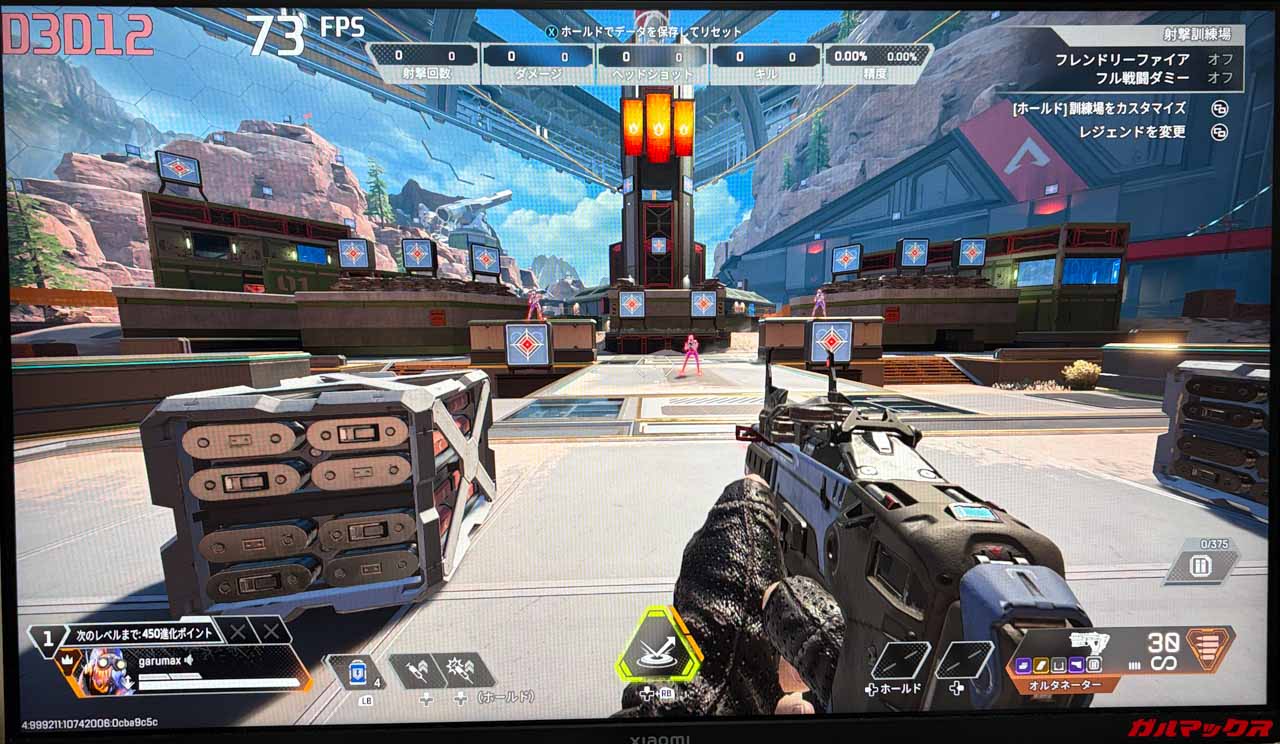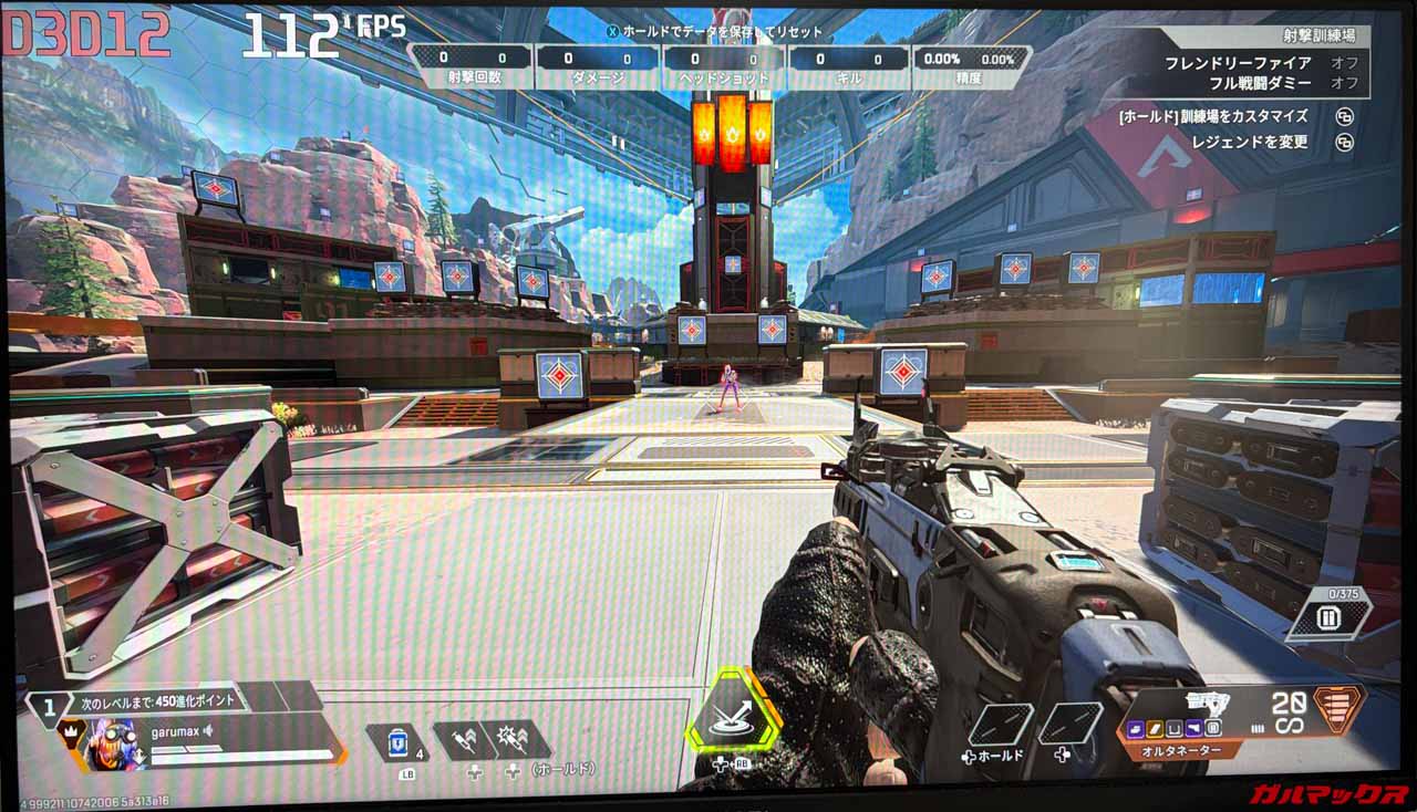 ▼私がメインで遊んでいるAPEX LEGENDSでもチェック。停止し解像度は1,920×1,080で視野角は110。停止していると70FPSほど出ていた。↓