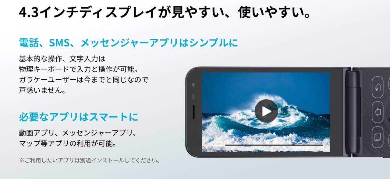 ▼搭載しているディスプレイはメインが4.3インチ。ガラケータイプとしてはなかなかの大画面!以下のように動画は横持ちの大画面で再生できるようです!↓