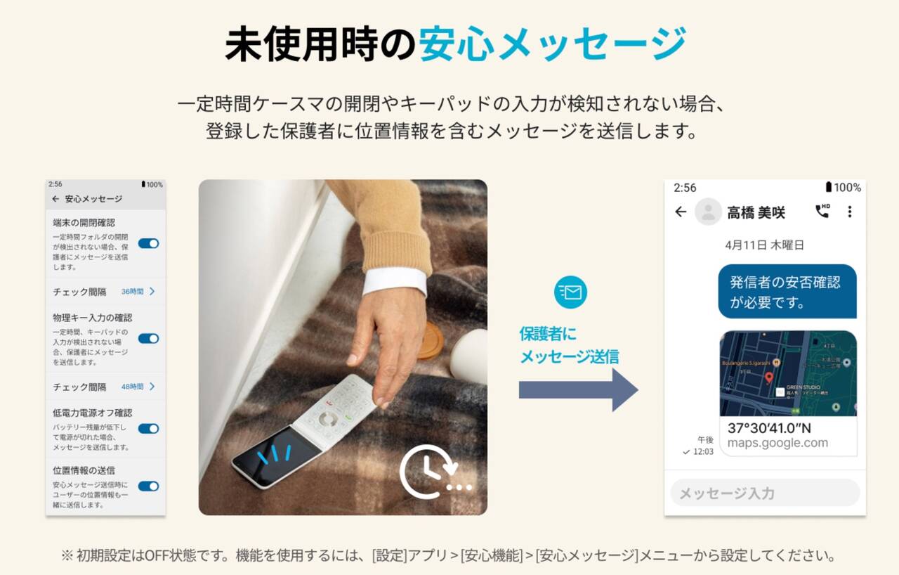 ▼一定時間、本体の開閉やキー入力が検知されない場合は登録した連絡先に位置情報を含むメッセージ送信機能も搭載。遠方に住む親に持たせる携帯電話としてもピッタリ。↓