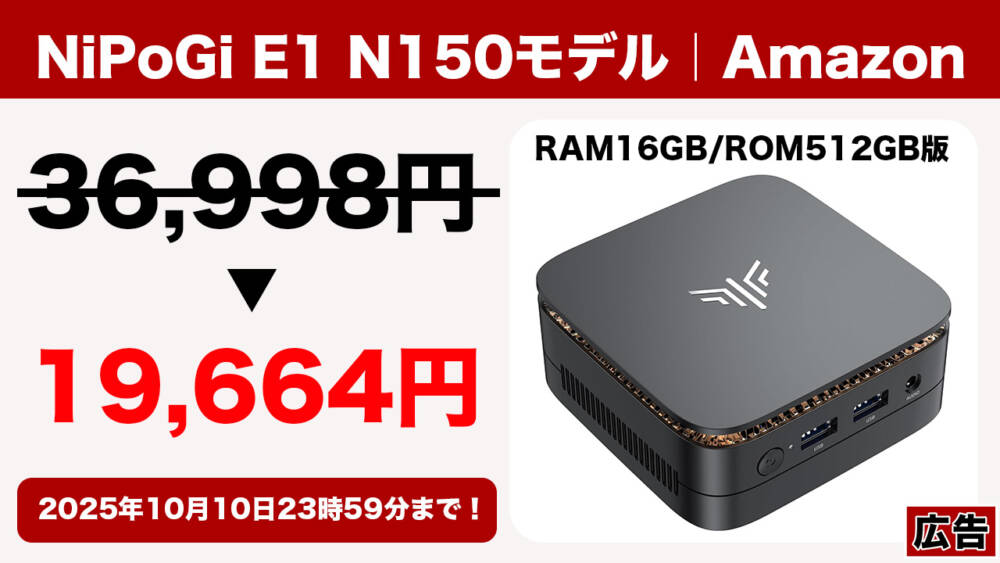 ガルマックスで何度か紹介している人気ミニPC「NiPoGi E1 N150モデル」のセールが再来。今回は要望の多かったメモリとストレージの多いモデルが割引対象となりました。