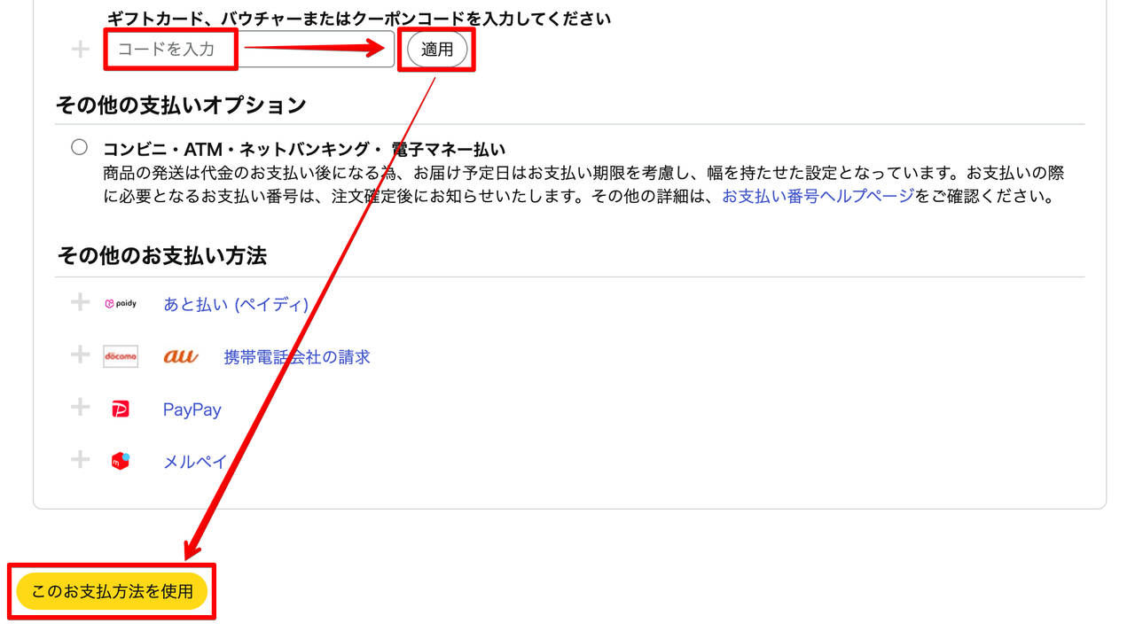 ▼カートに入れてレジへ進み、「ギフトカード、商品券、プロモーションコードを使用する」をクリック。以下の通りクーポンを適用しましょう!↓