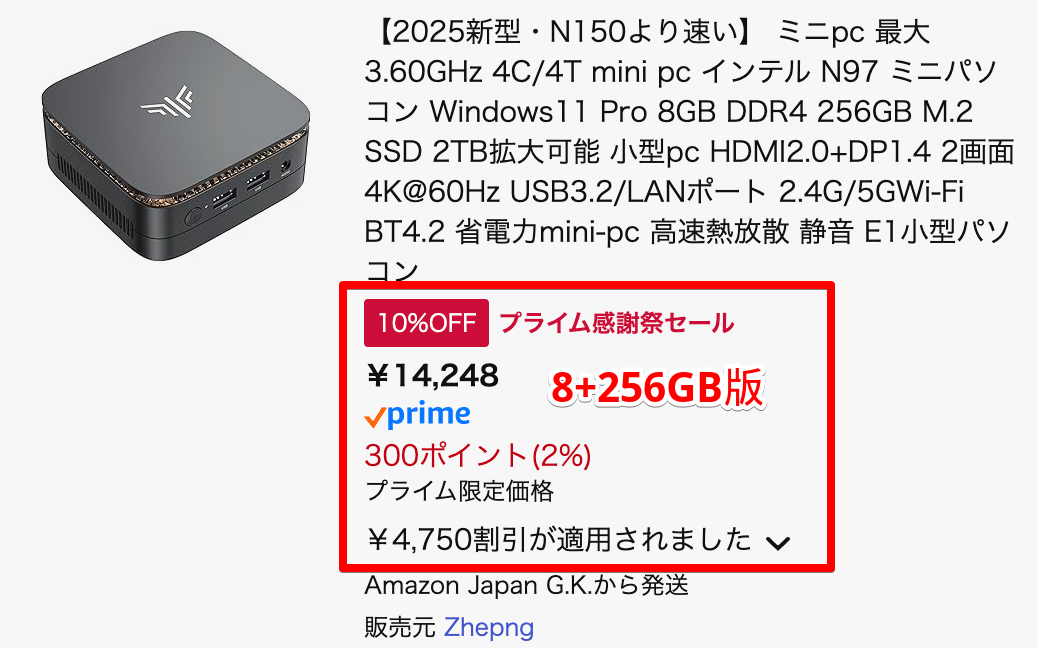 - メモリ8GB+容量256GB:14,248円