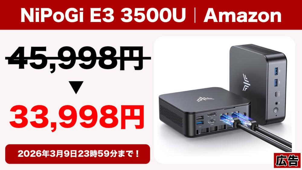 AmazonにてRyzen 5 3500U搭載ミニPC、NiPoGi E3が3月9日まで33,998円になるセールが開催中!