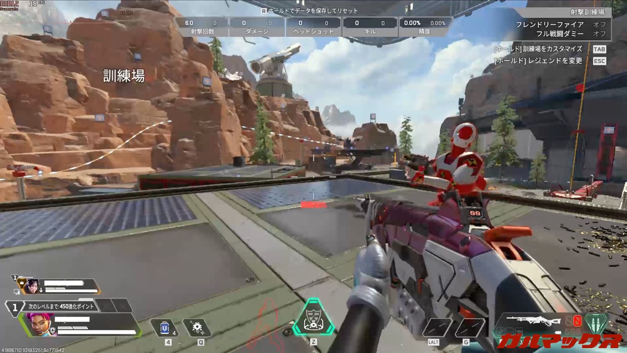 ▼APEX LEGENDSはFHD/低設定で訓練所内でテストを行いました。フレームレートは15FPS前後をウロウロするくらいで、動くターゲット相手でも中々エイムが定まりませんでした。↓