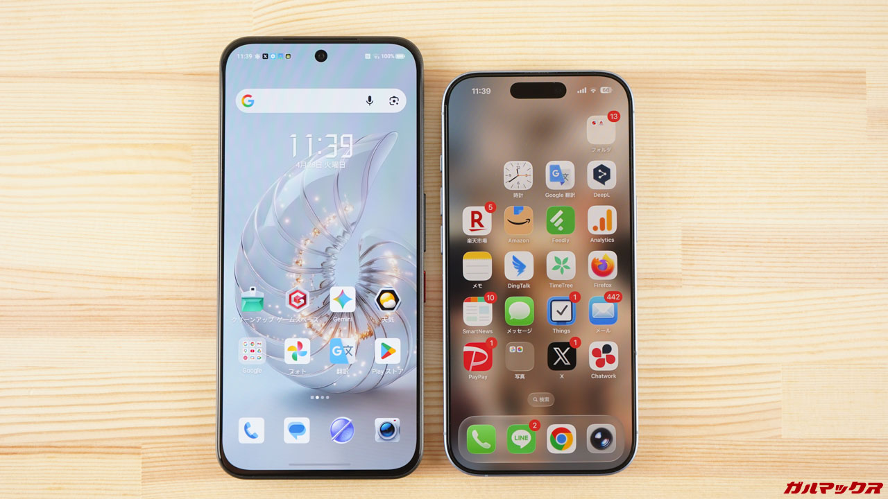 ▼ディスプレイは6.8インチでスマホとしては大型の部類です。標準的なサイズのiPhone 17と比較すると大きさがイメージしやすいかも。↓