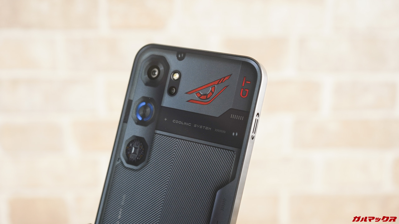 このロゴとカメラ下部に備わっている冷却ファン部分は、ライティング機能が埋め込まれています。ピカピカと光る様子はまさにゲーミングデバイス!色や点灯パターンを変えたり、不要であれば消灯もOKです。