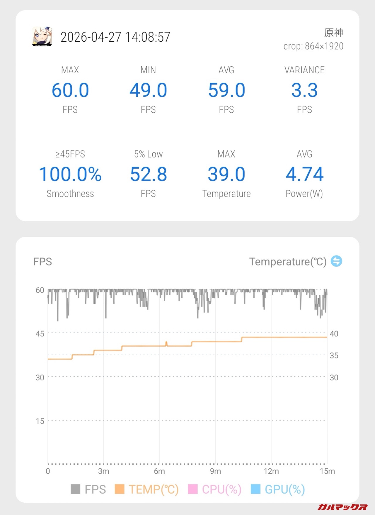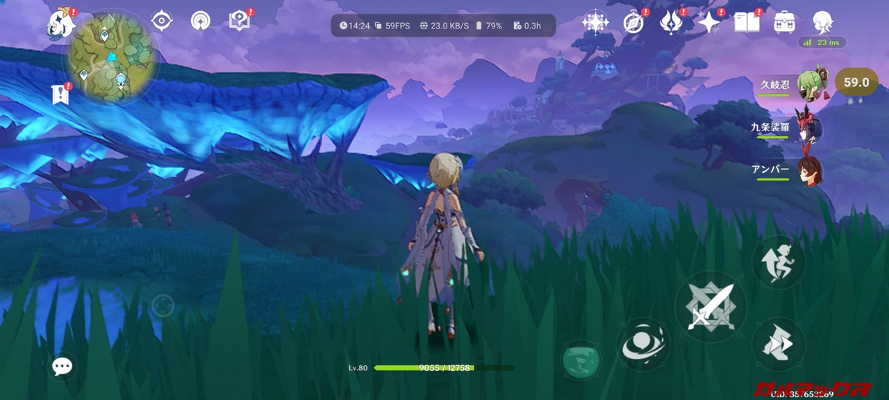 ▼まずは重量級の原神から。デフォルト画質「最低」でした。フレームレートのみ60に変更してプレイしたところ、平均59FPS、下限平均52.8FPSあたりと快適にプレイができちゃいました。正直30FPS切るかな?と思ってたのでビックリ↓