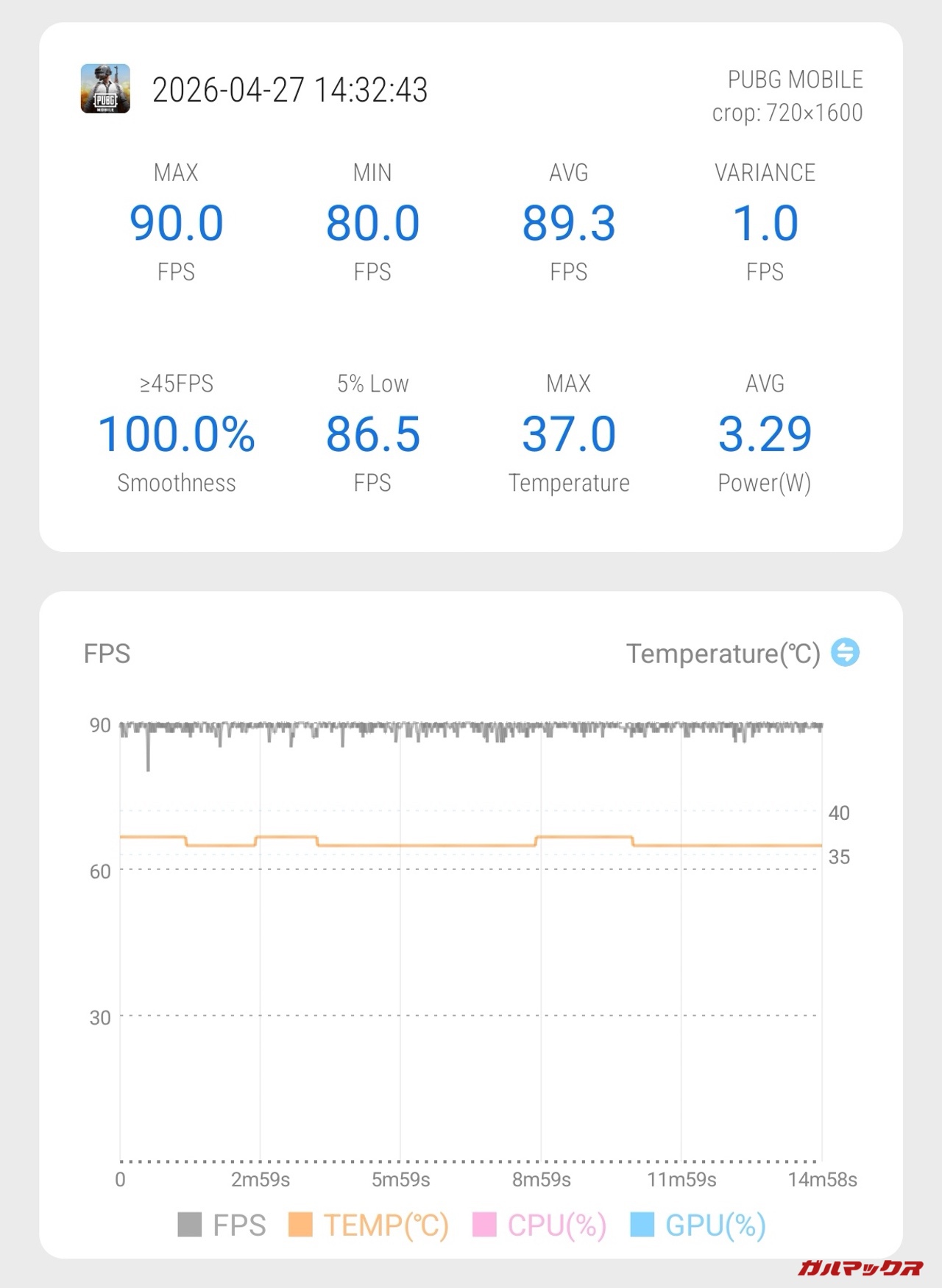 ▼続いては負荷が中程度のPUBGモバイル。フレームレート優先でプレイしたところ90FPSでのプレイが可能でした。平均89.3FPS、下限平均86.5FPSと非常に高い快適度を保っています。↓