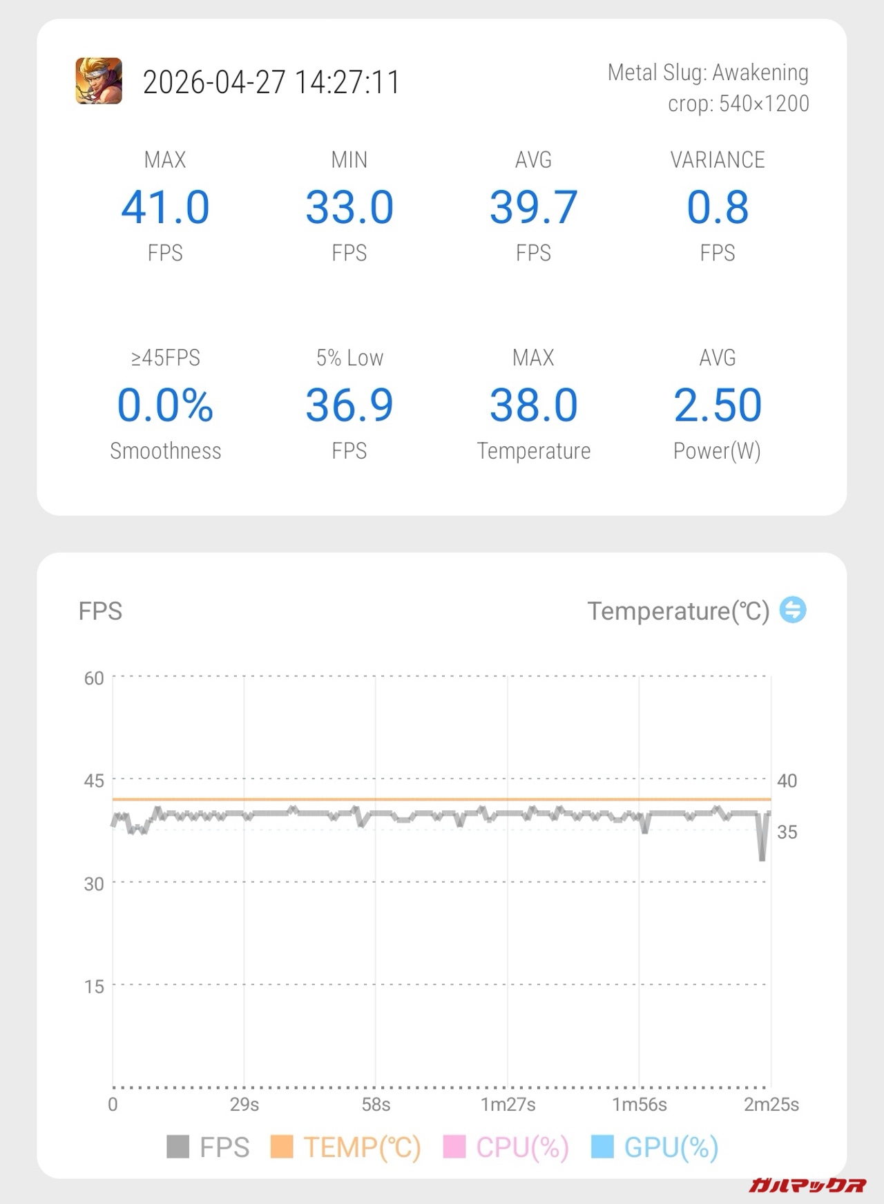 ▼次は2Dなのに結構重いメタルスラッグ。こちらもフレームレートを重視した「スムーズ」でプレイしたところ、概ね40FPSほどで遊べちゃいました。個人的には普通に楽しくプレイできてます。↓